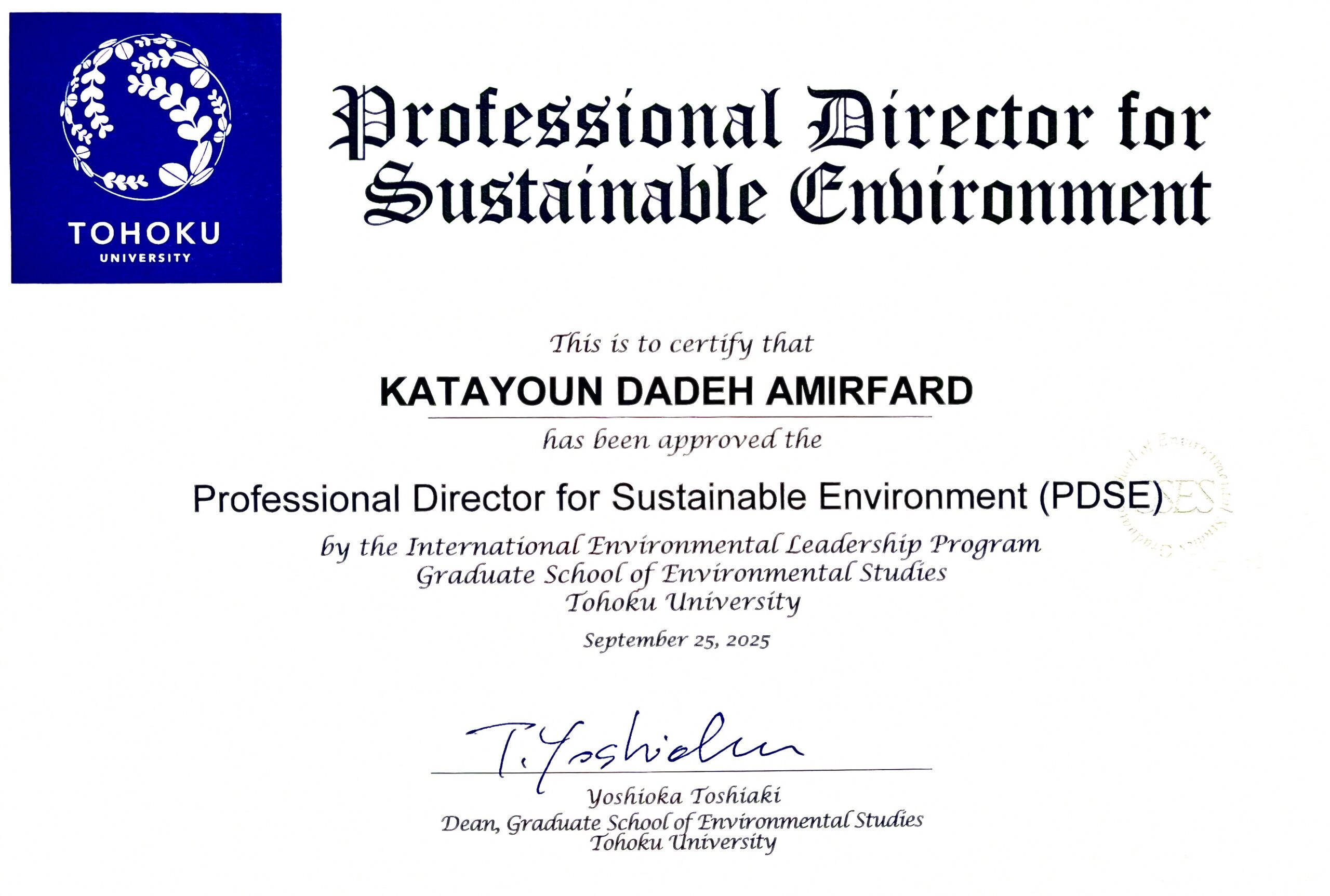 Katayoun Dadeh Amirfard was awarded Professional Director for Sustainable Environment (PDSE) by the international Environmental Leadership Progrm, Graduate School of Environmental Studies, Tohoku University. Congratulations!!!
